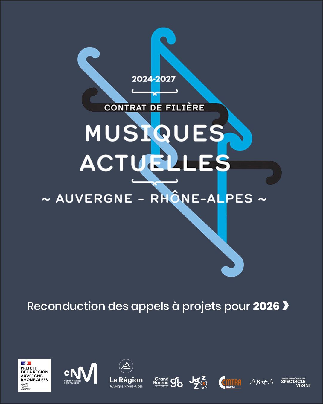 L’État (DRAC Auvergne–Rhône-Alpes), le Centre National de la Musique et la Région Auvergne-Rhône-Alpes poursuivent leur soutien aux musiques actuelles dans le cadre du contrat de filière Auvergne-Rhône-Alpes, avec la participation des réseaux (Grand Bureau, AMTA, CMTRA, JAZZ(s)RA) et de l’agence régionale Auvergne-Rhône-Alpes Spectacle Vivant.