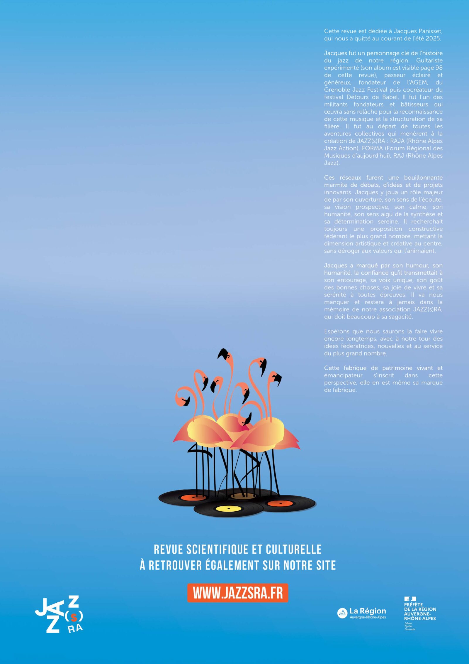Ce travail de recherche est dédié à Jacques Panisset, qui nous a quitté au courant de l’été 2025. Jacques fut un personnage clé de l’histoire du jazz de notre région. Guitariste expérimenté (son album est visible page 98 de cette revue), passeur éclairé et généreux, fondateur de l’AGEM, du Grenoble Jazz Festival puis cocréateur du festival Détours de Babel, Il fut l’un des militants fondateurs et bâtisseurs qui œuvra sans relâche pour la reconnaissance de cette musique et la structuration de sa filière. Il fut au départ de toutes les aventures collectives qui menèrent à la création de JAZZ(s)RA : RAJA (Rhône Alpes Jazz Action), FORMA (Forum Régional des Musiques d’aujourd’hui), RAJ (Rhône Alpes Jazz).