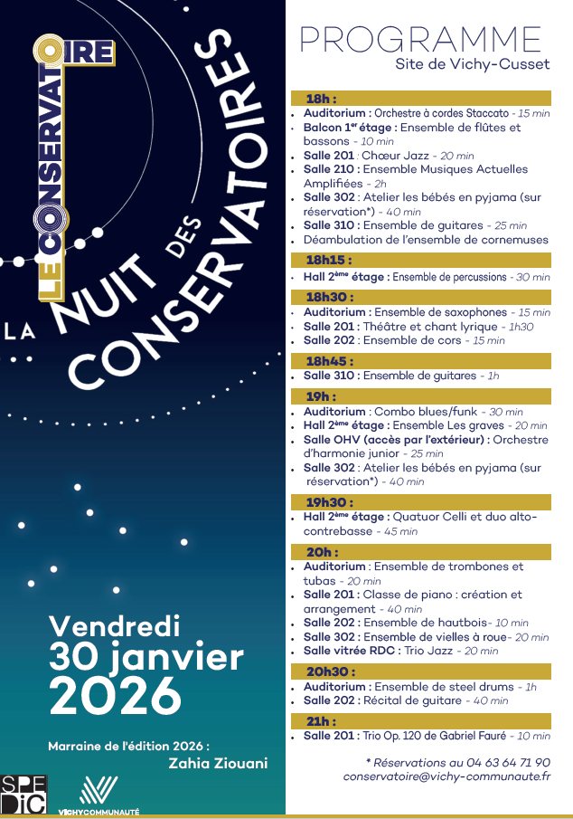 La Nuit des Conservatoires revient pour une nouvelle édition. Pour l’occasion l’ensemble de l’équipe vous prépare une soirée riche en concerts, avec des prestations d’élèves dans les différents étages du site de Vichy-Cusset.